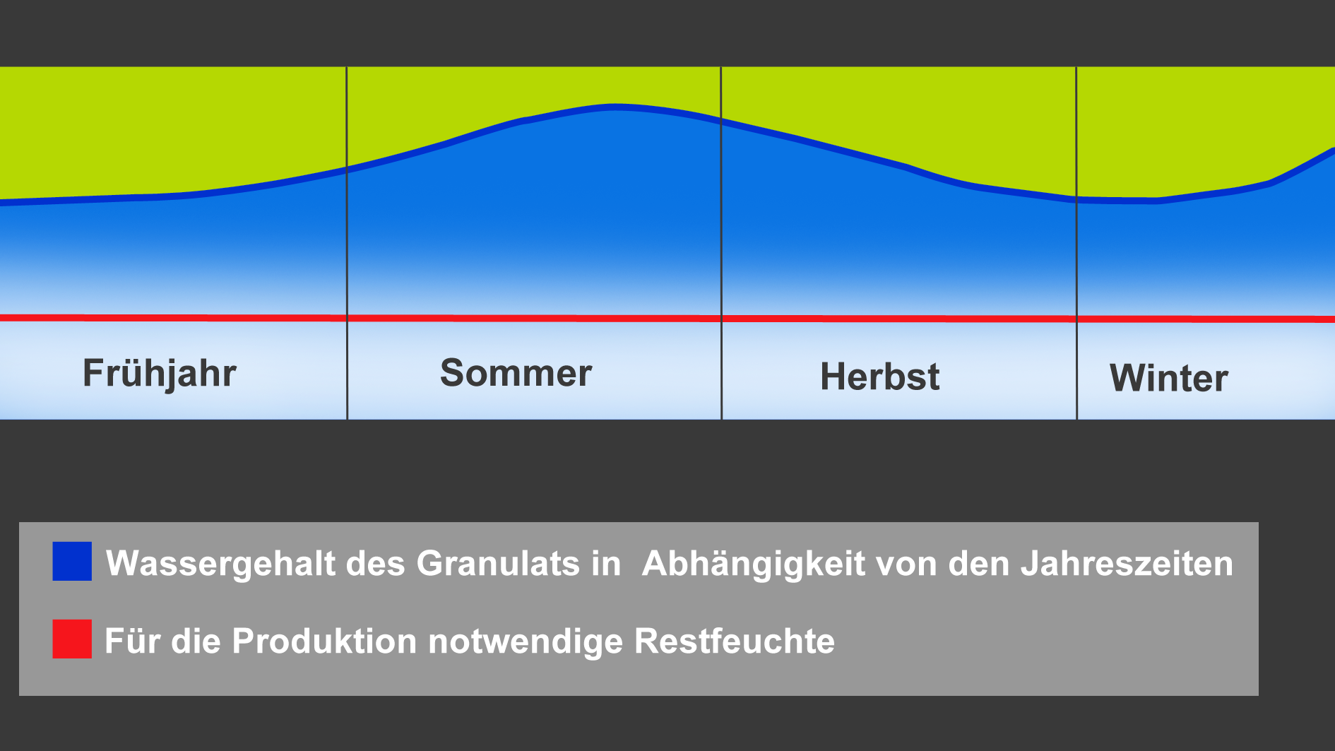 Durante o transporte e o armazenamento do granulado de plástico, ele pode absorver mais ou menos umidade, dependendo do plástico em questão. Muitos dos próprios plásticos são higroscópicos e literalmente atraem a umidade. O vapor de água pode até penetrar profundamente na estrutura molecular, o que é chamado de umidade do núcleo. As influências ambientais têm o maior impacto aqui e, portanto, o teor de umidade no granulado de plástico varia de acordo com a época do ano.
