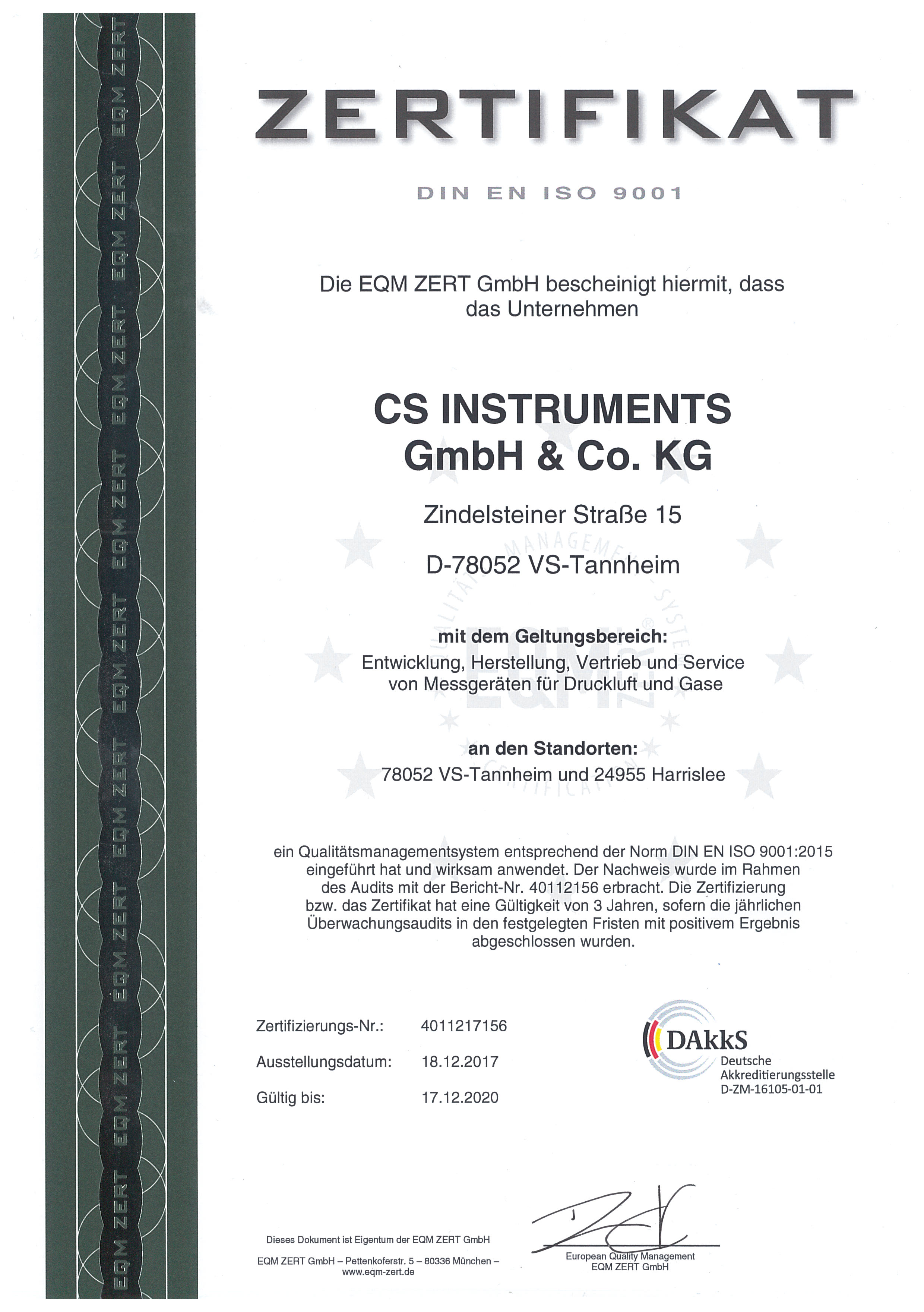 Durch die im Jahr 2017 neu erfolgte Akkreditierung nach DIN EN ISO 9001:2015 und die damit verbundene Vergabe des hier einsehbaren Zertifikats, können unsere Kunden und Partner sicher sein, dass die CS Instruments GmbH & Co. KG und damit auch unsere Produkte besonders hohe Vorgaben hinsichtlich Qualität, Umwelt und Sicherheit erfüllen. Damit geben wir sowohl unseren Kunden als auch unseren Geschäftspartnern die nötige Sicherheit, um im weltweiten Wettbewerb eines zunehmend globalen Marktes auch zukünftig erfolgreich zu bestehen.