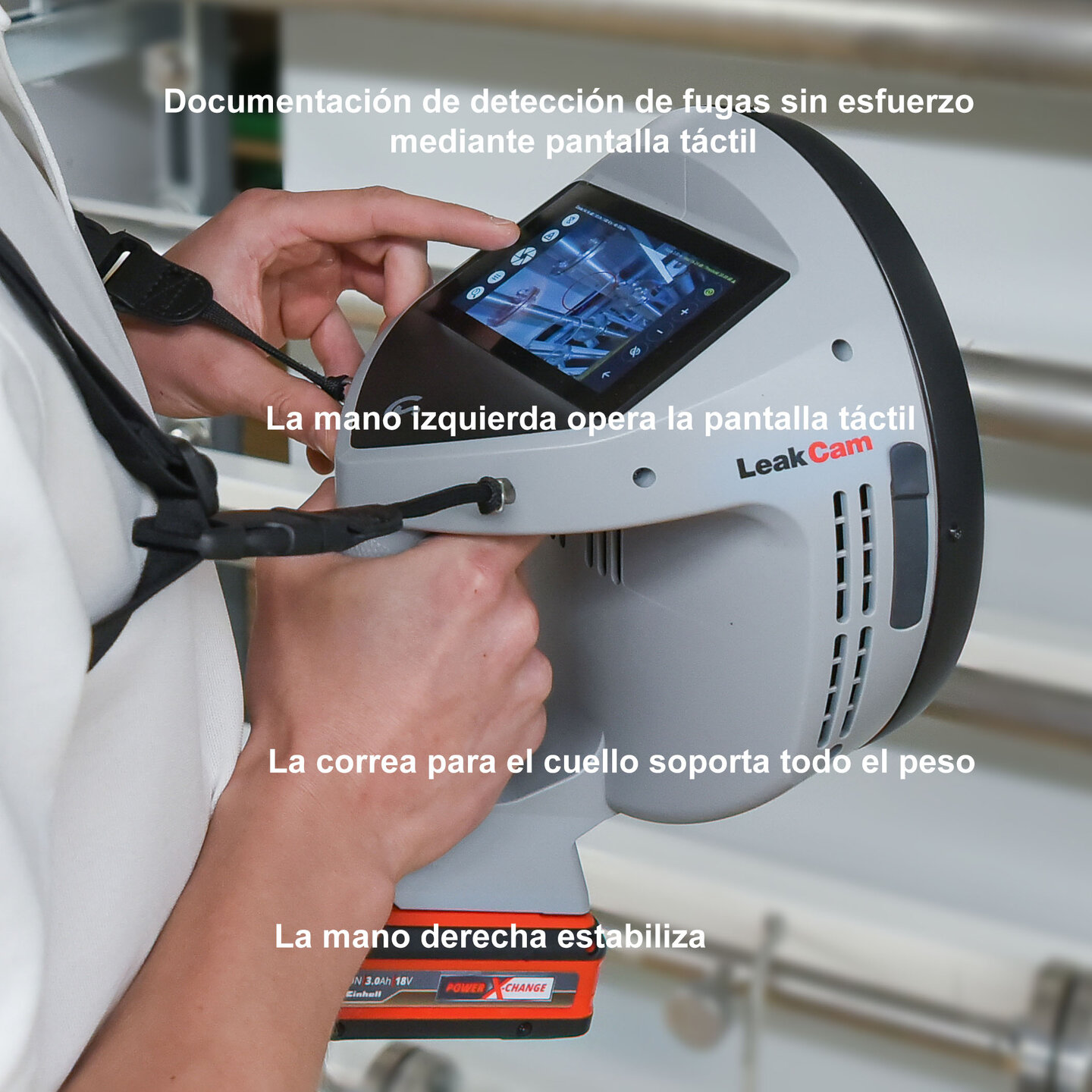 El sistema de transporte de la LeakCam 600 ofrece la máxima comodidad y una facilidad de uso óptima. La correa cruzada incluida en el juego sujeta el detector de fugas de forma segura y al alcance de la mano delante del pecho. Gracias a las baterías Einhell 18 V 2 Ah (aprox. 2,5 horas) y 18 V 4 Ah (aprox. 5 horas) incluidas en el set, se beneficiará de una fuente de alimentación flexible con un peso mínimo para auditorías prolongadas. Con el cargador externo, puede utilizar una batería mientras se carga la otra, lo que le permite trabajar sin interrupciones.