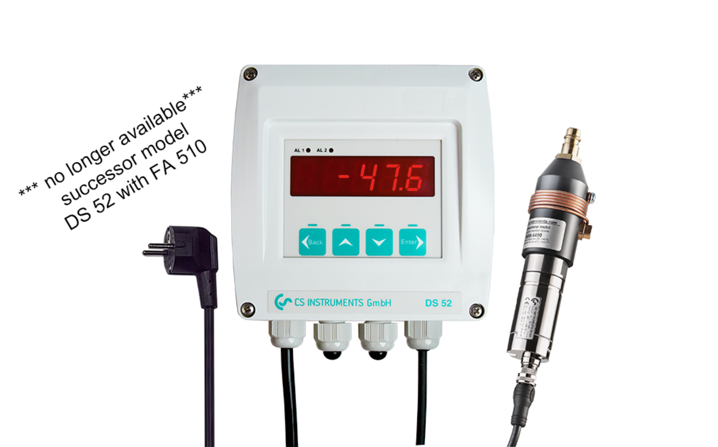Composé du compteur de processus numérique DS52 et du transmetteur de point de rosée FA510 avec une plage de mesure de -20° à +50°C.