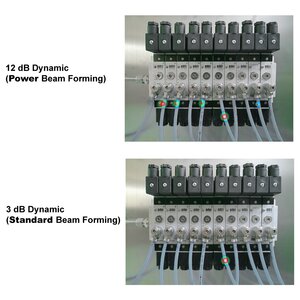 The LeakCam 600's Power Beamforming algorithm uses the signals from 64 ultrasonic MEMS microphones and their positions to locate multiple leakages simultaneously. With a unique dynamic range of up to 12 dB, the LeakCam enables the simultaneous detection of leaks of different volumes - without larger leaks or ultrasonic noise masking smaller leaks. The dynamic range therefore describes the ability to detect sound sources of different volumes without loud sources masking quiet sources. In comparison, conventional leak detectors using the standard beamforming algorithm only achieve a dynamic range of 3 dB, which severely limits their ability to detect multiple leakages at the same time.